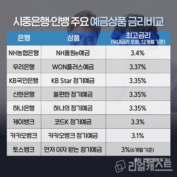 이외에도 12개월 기준 KB국민은행(은행장 이재근) ‘KB Star 정기예금’ 최고 연 3.35%, 신한은행(은행장 정상혁) ‘쏠편한 정기예금’ 최고 연 3.35%, 하나은행(은행장 이승열) ‘하나의 정기예금’ 최고 연 3.35%로 확인됐습니다.