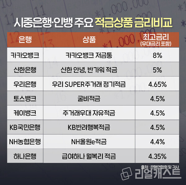 이에 조금이라도 많은 이자를 받기 위해 소비자들은 예·적금 상품을 알아보고 있는 상황입니다. 이런 가운데 리얼캐스트가 시중은행과 인터넷전문은행(이하 인뱅)의 주요 상품에 대해 살펴봤습니다. 결과는 쉽게 말해 예금은 시중은행이 적금은 인뱅의 금리가 높은 것으로 확인됐습니다.