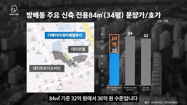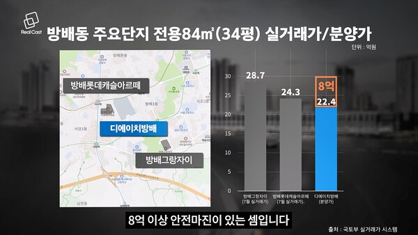 현재 방배동 대장인 방배그랑자이 전용 84㎡가 7월에 28억 원, 10년 넘은 롯데캐슬도 같은 시기 24억 3천만 원으로 거래됐죠. 방배동 신축 대장이 유력하다는 점을 고려해서 시세를 30억 정도로 예상하면, 8억 이상 안전마진이 있는 셈입니다.