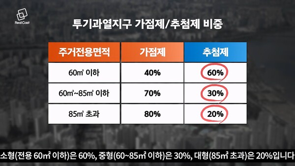 추첨제 비중은 소형(전용 60㎡ 이하)은 60%, 중형(60~85㎡ 이하)은 30%, 대형(85㎡ 초과)은 20%입니다. 가점제 비중이 높죠. 참고로 앞서 진행한 래미안 원펜타스 커트라인은 69점이었습니다. 치열한 가점 승부가 예상되네요. 아무쪼록 좋은 결과 있으시길 바랍니다.