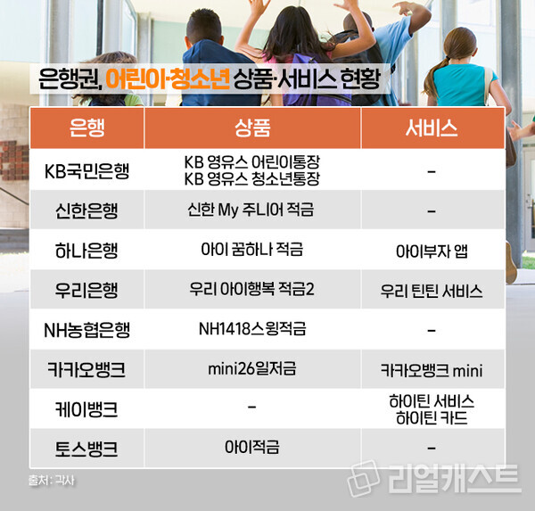기존 시중은행에 인터넷전문은행(이하 인뱅)이 등장한데 이어 지난 5월 지방은행이 시중은행으로 전환하는 등 은행권에서 경쟁이 치열해지고 있습니다. 이에 미래고객이라 할 수 있는 어린이·청소년을 사로잡기 위한 다양한 상품을 내놓고 있는데요. 이와 관련해 리얼캐스트에서 살펴봤습니다.