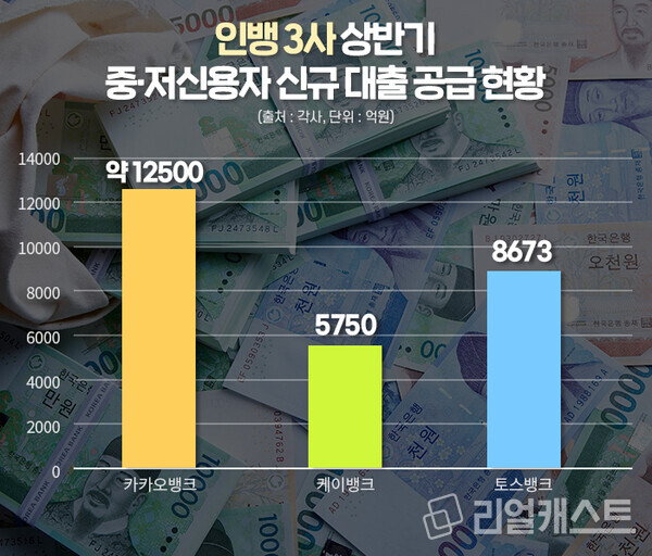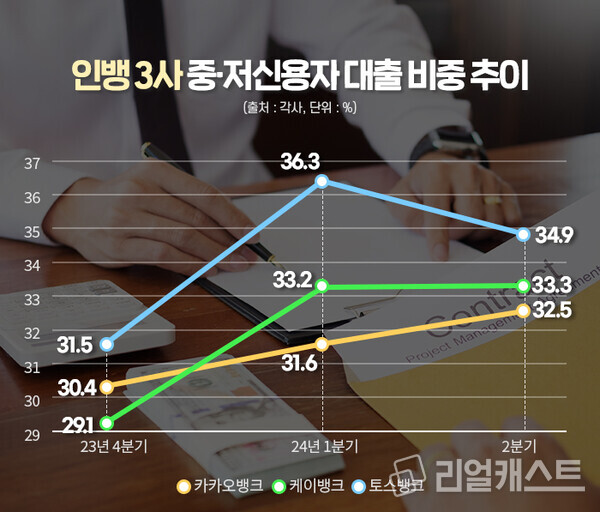 인터넷전문은행(이하 인뱅) 3사가 모두 상반기 중·저신용자 대출 비중이 2개 분기 연속 30%를 돌파한 것으로 확인됐습니다.