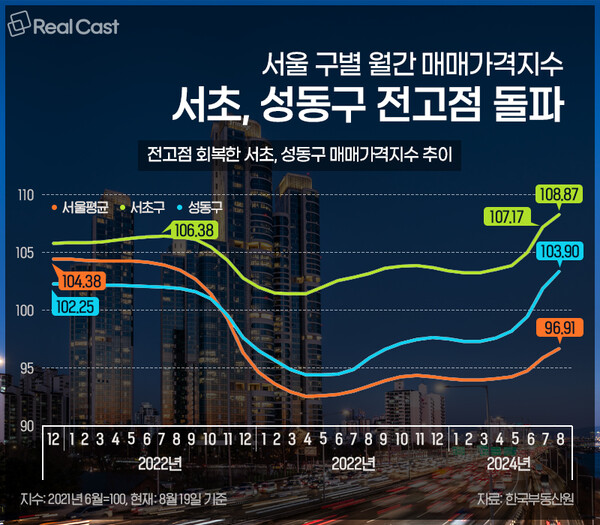 최근 서울 아파트 매매가격 오름폭이 커지면서 서초구와 성동구 등 일부지역은 과거 전고점을 넘어선 것으로 나타났습니다. 조만간 전고점을 넘어설 것으로 보이는 지역은 어디일까요? 리얼캐스트가 서울 구별 집값 상황을 정리해 봤습니다.