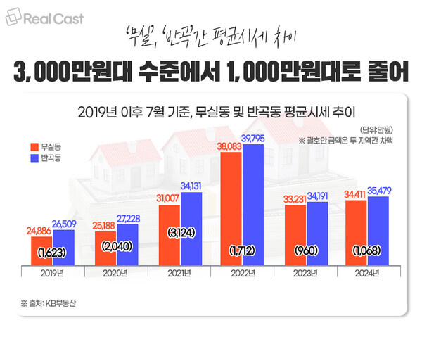 관련 통계를 거슬러 올라가면 2021년 당시엔 두 지역간 시세차이가 3,000만원대까지 벌어져 있었으나 2023년경엔 1,000만원 미만까지 좁혀지기도 했었습니다.