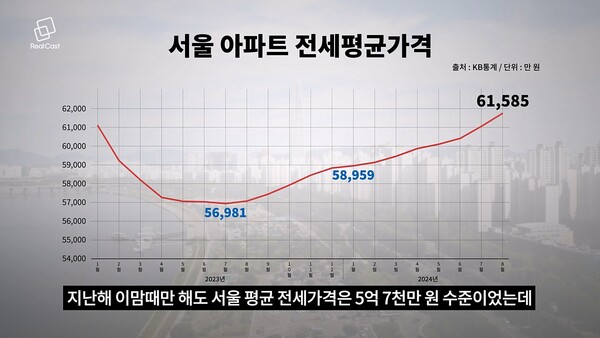 이런 상황이면 “비싸면 딴데 알아봐”도 가능하겠죠? 그래서 전세가격도 상승세를 타고 있습니다. 지난해 이맘때만 해도 서울 평균 전세가격은 5억 7천만 원 수준이었는데, 지금은 6억 1천만 원으로 올랐죠. 1년 만에 4천만원 올랐네요.