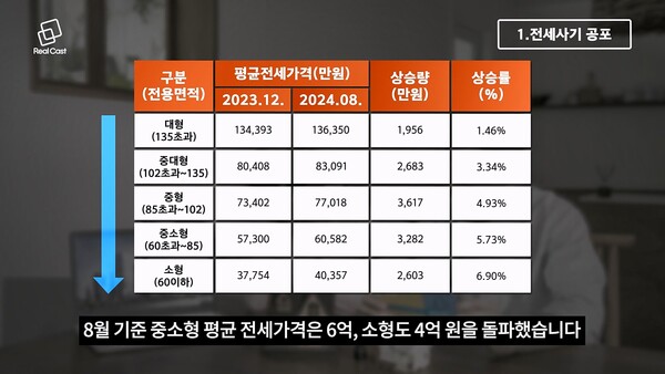 이렇게 비아파트에서 이탈한 수요는 고스란히 중소형 이하 아파트로 흡수되고 있죠. 실제로 상승률은 전용면적이 작을수록 가파른 경향을 보입니다. 8월 기준 중소형 평균 전세가격은 6억, 소형도 4억 원을 돌파했습니다.