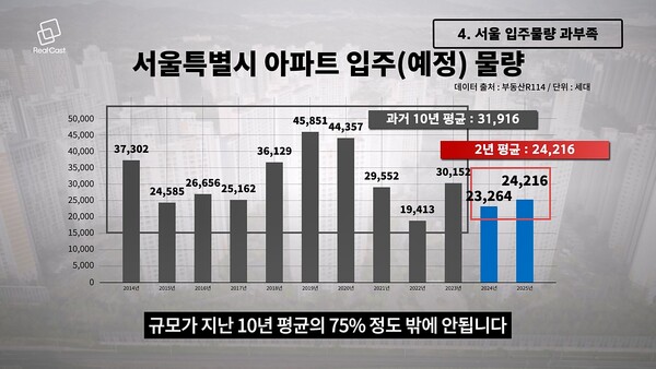 더 참는다고 상황이 좋아질 것도 없습니다. 서울 입주물량이 넉넉한게 아니거든요. 전세 공급이 가능한 임대제외 공급물량은 올해부터 내년까지 연평균 2만 4,000가구 정도 되는데요. 규모가 지난 10년 평균의 75% 정도 밖에 안됩니다.