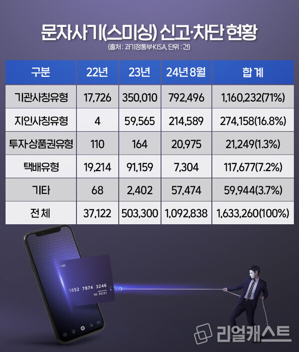 이처럼 관계 당국에서 확인한 문자사기(스미싱) 신고·차단 현황에 따르면 22년~24년 8월까지 총 163만 3260건이 파악됐습니다. 연평균으로 보면 약 60만 건이 넘는 사례가 접수되고 있는 셈으로, 이는 단순한 경고 수준을 넘는 실질적 위협으로 볼 수 있습니다.