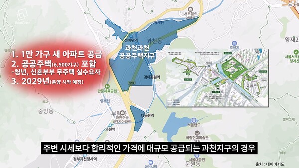 과천 원도심 북쪽의 공공주택지구(과천과천 지구)에는 1만 가구의 새 아파트가 들어섭니다. 청년, 신혼부부 등 무주택 실수요자를 위한 공공주택(6500가구)이 포함됐으며, 2029년부터 분양이 시작될 예정입니다.