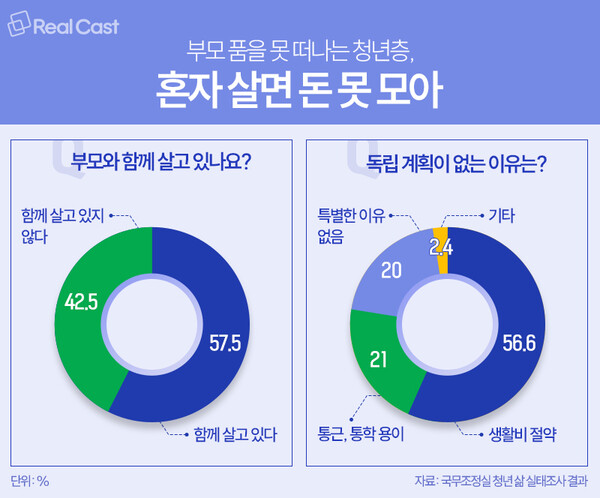 특히 부모와 함께 사는 청년 중 67.7%는 독립 계획이 없다고 응답했으며, 그 이유로는 ‘생활비 절약 목적’이라는 응답이 56.6%로 가장 많았습니다. 결국 청년층이 자립을 하지 못하는 주요 원인이 경제적 여건 부족이라는 점이 통계로 확인된 셈입니다.