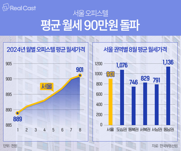 1~2인 가구가 많이 선택하는 오피스텔 월세도 90만원을 돌파했습니다. 한국부동산원에 따르면 8월 기준 서울 오피스텔 평균 월세는 90만1,000원으로, 올해 초보다 1만2,000원 상승했습니다. 강남구가 포함된 동남권은 113만6,000원, 도심권은 107만6,000원으로 월 100만원 이상을 지불해야 주거가 가능한 수준입니다.