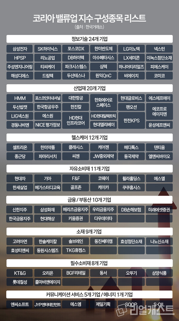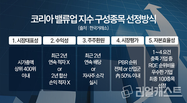 이 지수에는 한국거래소(이사장 정은보)가 시가총액(이하 시총), 배당과 자사주 소각, 자기자본이익률(ROE) 등 5개 항목의 지표가 높은 상장기업들로 구성됐습니다.