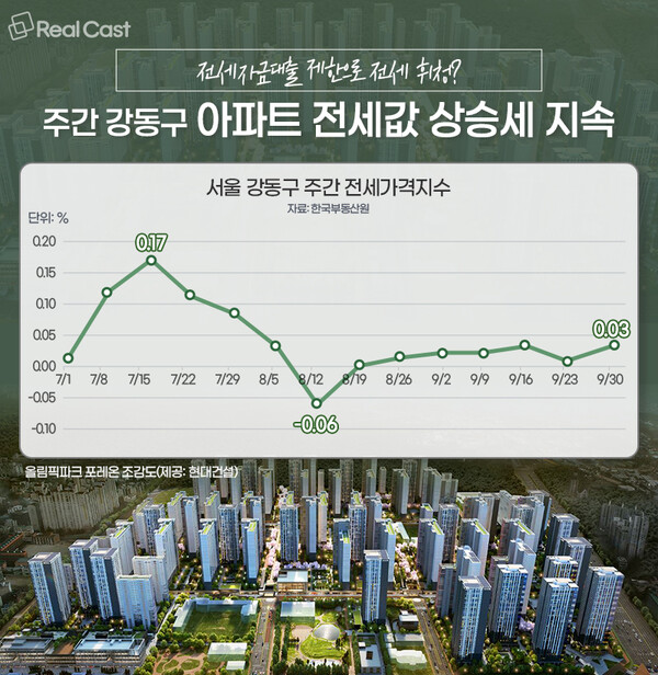 실제로 한국부동산원 전국 주택가격동향 자료에 따르면, 9월 강동구 주간 전세가격지수는 9월 9일 0.02%, 9월 16일 0.03%, 9월 23일 0.01%, 9월 30일 0.03%로 소폭이나마 꾸준히 상승하고 있습니다.