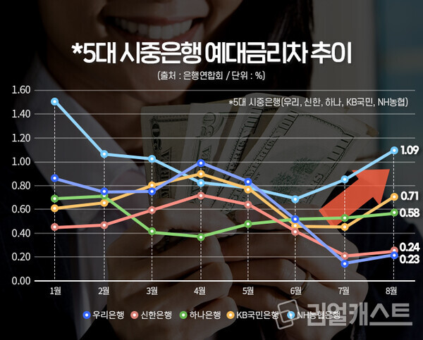 예대금리차가 가장 컸던 은행은 1.09%p를 기록한 NH농협은행입니다. KB국민은행이 0.71%p를 기록했고, 그 뒤를 하나은행(0.58%p)과 신한은행(0.24%p), 우리은행(0.23%p)이 이었습니다.