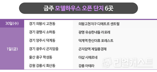 금주 모델하우스 오픈 예정인 곳은 총 6곳입니다. 권역별로는 수도권(경기) 4곳, 지방 2곳입니다.