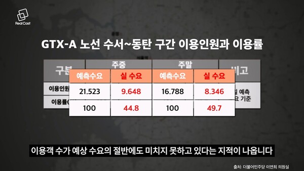 문제는 수요가 예상보다 저조하다는 점입니다. 일각에선 GTX-A 수서~동탄 구간 개통 이후 이용객 수가 예상 수요의 절반에도 미치지 못하고 있다는 지적이 나옵니다.