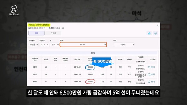 일례로 B노선 수혜지역인 인천 미추홀구의 용현자이크레스트 전용 84㎡의 경우 8월초만 해도 5억5500만원에 계약됐지만 가장 최근 거래가는 4억9000만원까지 떨어졌습니다. 한 달도 채 안돼 6500만원 가량 급감하며 5억 선이 무너졌는데요.