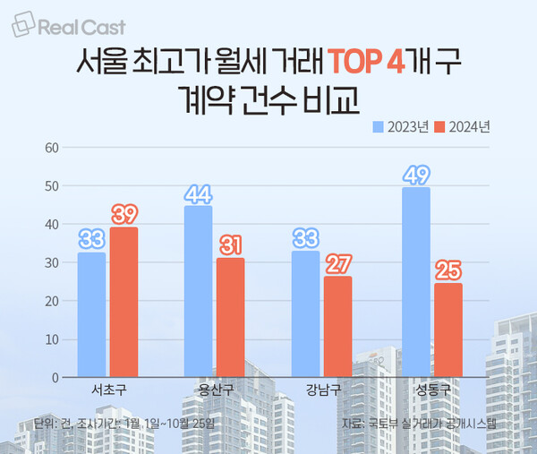 국토부 실거래가 공개시스템에 따르면, 올해 1월 1일부터 10월 25일까지 서울에서 월 1,000만원 이상 최고가 월세 거래는 총 130건 이뤄진 것으로 조사됐습니다. 그 중 거래 건수가 가장 많은 곳은 서초구로 39건 거래됐습니다. 이후 용산구 31건, 강남구 27건, 성동구 25건 순입니다.