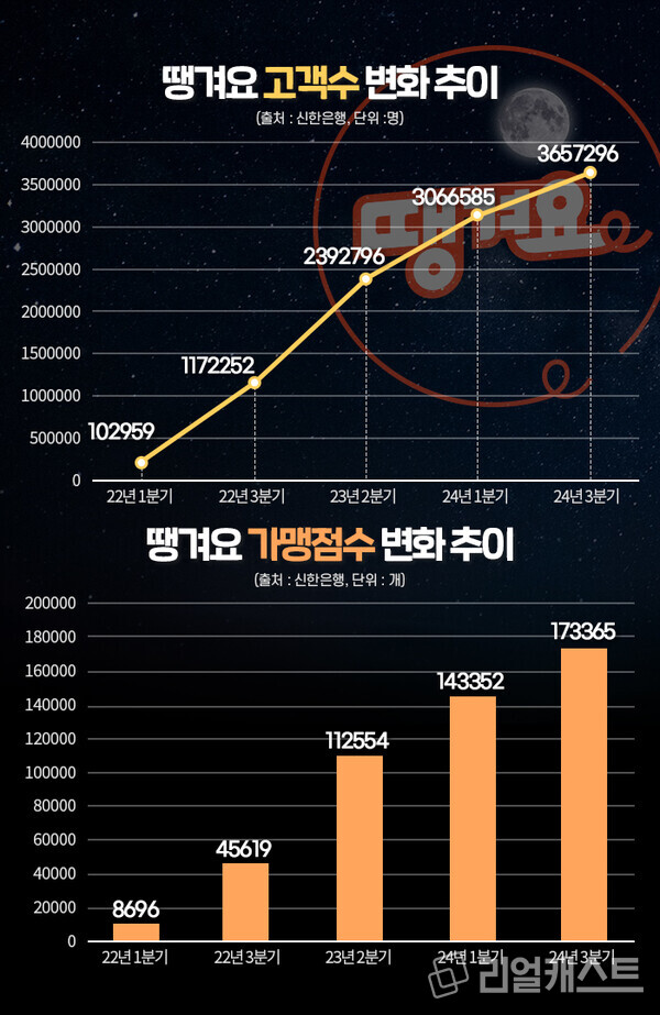전국적으로 땡겨요 가맹점이 늘어남에 따라 고객수도 큰 폭으로 늘어났습니다. 22년 1분기 10만 2959명에 불과했던 고객수는 올해 3분기말 기준 365만 7296명으로 35배 이상 늘어난 것으로 확인됐습니다.