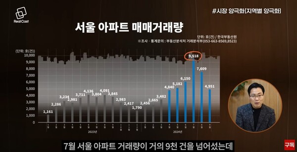 실제 7월 서울 아파트 거래량이 거의 9천 건을 넘어섰습니다. 이는 1만 건 이상 거래가 됐던 2020년, 2021년 이후 세 번째로 많은 거래량입니다.