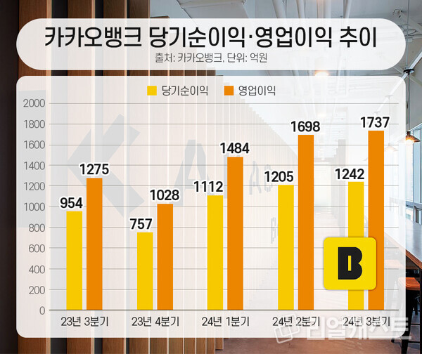 카카오뱅크는 6일 2024년 3분기 실적을 발표했습니다. 올해 3분기까지 누적 당기순이익은 3556억 원을 기록하며 전년 동기(2793억 원)와 비교해 27.3% 증가한 것으로 확인됐습니다. 누적 영업이익은 4919억 원으로 지난해 3분기(3757억 원)보다 30.9% 늘었습니다. 3분기만 놓고보면 카카오뱅크는 당기순이익 1242억 원, 영업이익 1737억 원을 거뒀습니다.