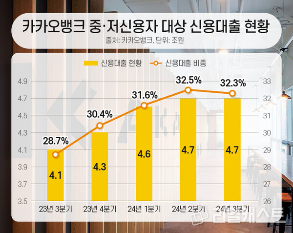 한편, 카카오뱅크는 포용금융에도 신경 쓰고 있는 모습입니다. 중·저신용자 대상 신용대출의 경우 중도상환해약금 전액 면제로 중·저신용 대출 비중 유지가 쉽지 않은 상황임에도 9월 말 기준 잔액은 4조 7000억 원, 비중은 32.3%로 집계됐습니다.