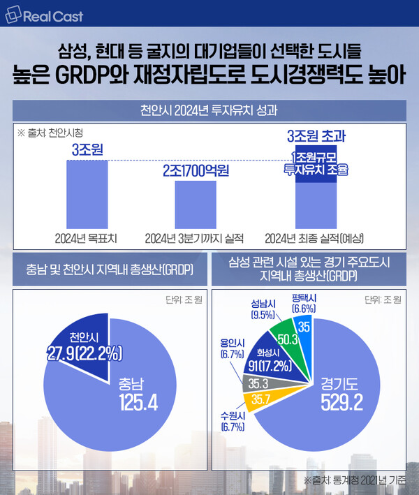 통계청에 따르면 충남의 2021년 기준 GRDP는 125.4조원이며 천안시는 27.9조 원으로 충남 GRDP의 22.2%를 차지하고 있습니다. 삼성관련 대규모 시설들이 공통적으로 자리잡고 있는 경기 수원(35.7조 원), 용인(35.3조 원), 화성(91조 원), 성남(50.3조 원), 평택(35조) 등 5개 도시의 GRDP 합은 경기도 GRDP(529.2조 원)의 46.1%를 차지하고 있습니다.