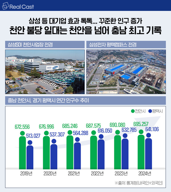 삼성디스플레이, 삼성SDI 등이 자리잡은 천안제3일반산업단지, 아산디스플레이시티 등이 있는 천안 서북구와 아산탕정 일대, 삼성전자 평택캠퍼스가 있는 경기 평택시 등은 삼성효과로 인구가 꾸준하게 증가하고 있습니다.