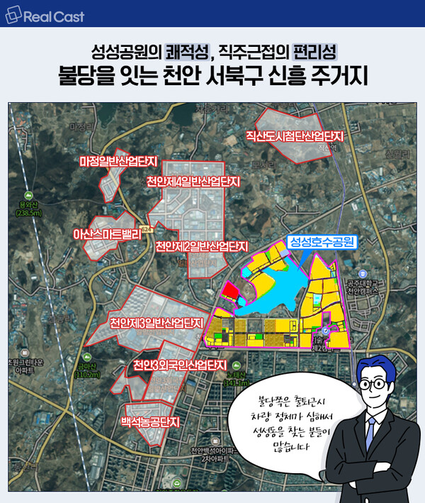 특히 성성동 일대는 성성호수공원을 중심으로 곳곳에서 도시개발사업이 추진되면서 새 아파트들이 들어서 천안의 강남이라 불리는 불당을 잇는 신흥 주거지로 평가 받고 있습니다.