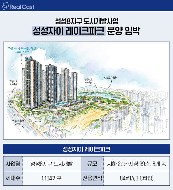 GS건설이 성성8지구 도시개발사업을 통해 짓는 이 아파트는 지하 2층~지상 39층, 8개동 총 1,104가구 규모며 전용면적 84㎡ 3개 타입으로 구성됐습니다.