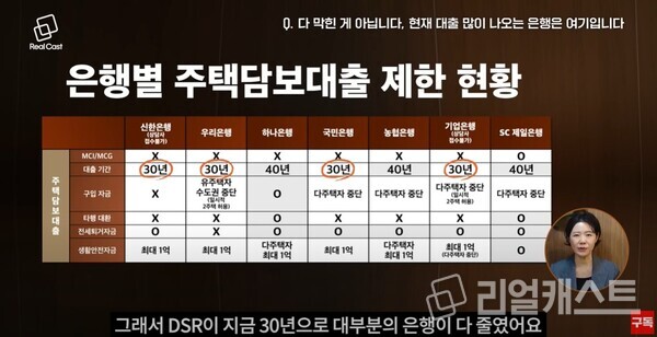 또한 현재 모든 은행 대출이 막힌 게 아닙니다. MCI를 쓸 수 있는 은행이 제일은행이 남아 있고 DSR도 하나은행과 제일은행이 40년입니다. 그리고 전세대출도 하나은행과 제일은행은 가능합니다.