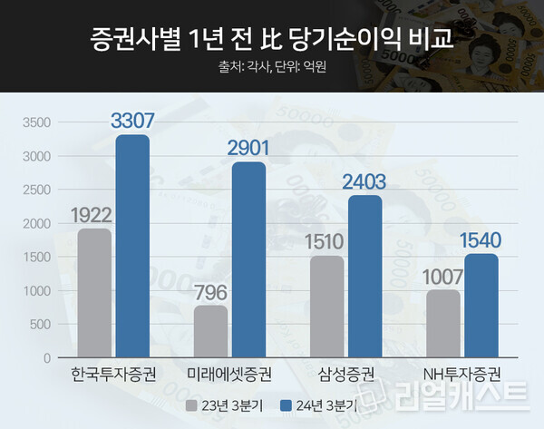 각 증권사별로 살펴보면 한국투자증권 3307억 원, 미래에셋증권 2901억 원, 삼성증권 2403억 원, NH투자증권 1540억 원을 시현한 것으로 조사됐습니다.