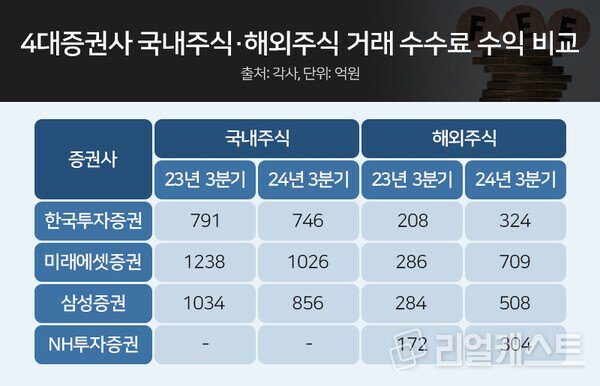 NH투자증권의 3분기 브로커리지 수수료 수익은 1107억 원으로 지난해 3분기(1218억 원)와 비교하면 14.5% 감소한 것으로 나타났습니다. 반면 해외주식 수수료 수익은 172억 원에서 304억 원으로 76.7% 늘어난 것으로 확인됐습니다.