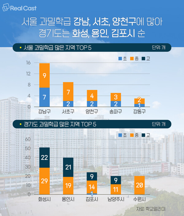 고등학교는 1,434곳 중 181곳이 과밀학급인 것으로 조사됐습니다. 화성시 22곳, 용인시 21곳, 김포시, 남양주시 9곳, 인천 서구 8곳 순입니다. 초중고를 합해보면 화성시와 용인, 김포, 남양주, 수원시 그리고 서울에서는 강남, 서초 지역에 과밀학급이 많았는데요. 서울은 초, 중학교에 집중돼 있고, 경기도는 중, 고등학교에 많았습니다. 특히 경기권은 신도시나 택지지구 개발로 아파트가 많이 들어선 곳인데요. 학령인구 대비 학교 수가 적거나 학군, 학원가가 잘 형성돼 있는 곳이 많습니다.