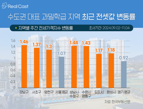한국부동산원 자료에 따르면, 주간 아파트전세가격지수는 9월 2일부터 11월 4일까지 서울 평균 1.07% 상승한 가운데, 강남구 1.46%, 서초구 1.37%, 양천구 1.30% 등 평균을 상회하는 수치를 보였습니다.