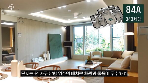 먼저 전용 84㎡A에 들어가 봤습니다. 전용 84㎡A는 총 343가구로 구성되며 내부로 들어가면 널찍한 워크인장이 보입니다. 거실로 들어서면 세련되면서도 편안한 인테리어가 눈에 띄는데요.