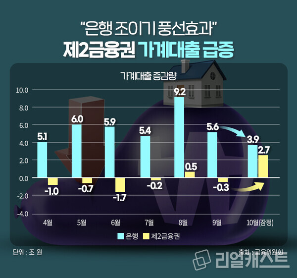 10월 가계대출 증가의 원흉은 제2금융권입니다. 은행권 가계대출은 3조 9천억 원 증가해서 전월(+5.6조 원)보다 증가폭이 축소되었으나, 제2금융권 가계대출은 지난달에만 2조 7천억 원 증가해서 전월(-0.3조 원) 대비 큰 폭으로 늘었습니다.