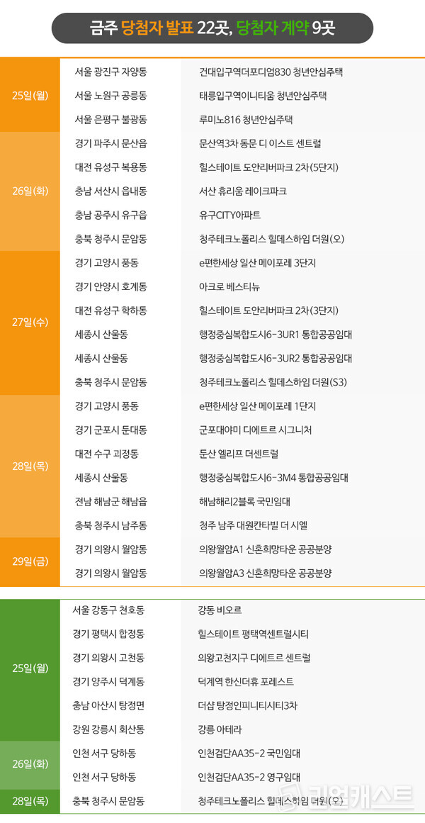 부동산인포에 따르면 11월 4주 전국에서 신규 청약 및 입주자를 모집하는 곳은 9곳, 총 9234가구로 집계됐습니다(총 가구수 기준).