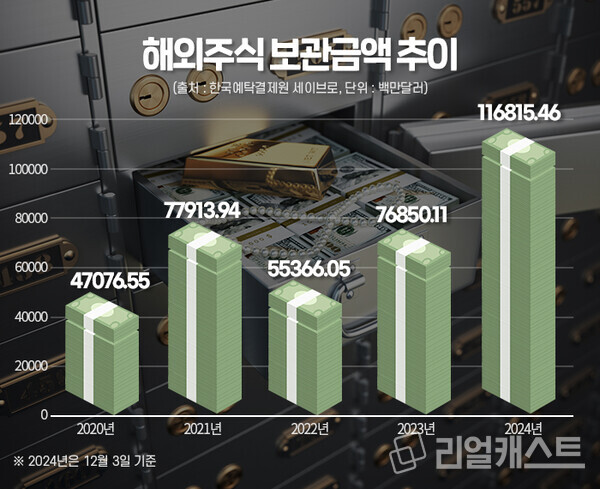 특히 미국주식 보관금액이 크게 늘어났습니다. 지난해 680억 2349만 달러였던 미국주식 보관금액은 3일 기준 1070억 4735만 달러로 57% 이상 급증한 것으로 확인됐습니다.