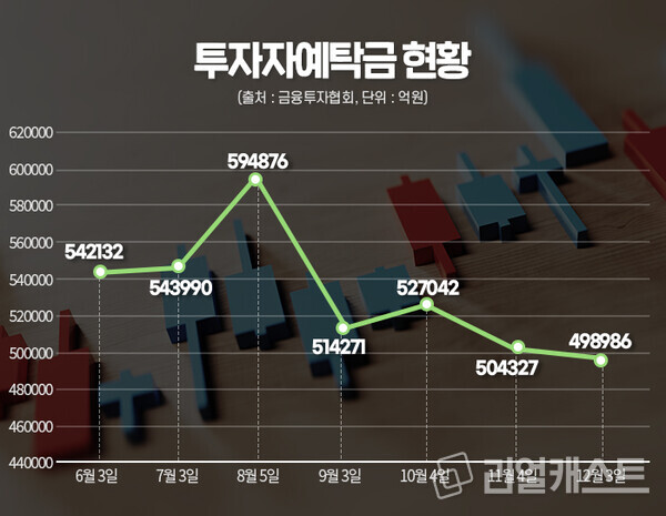 이와 달리 국내 증시에선 자금 이탈이 가속화되는 것으로 나타났습니다. 금융투자협회에 따르면 지난 8월 5일 59조 4876억 원에 달했던 투자자예탁금은 하락세를 이어가다 10월 30일 50조 원이 붕괴된 이후 등락을 거듭하며 12월 3일 49조 8986억 원으로 확인됐습니다.