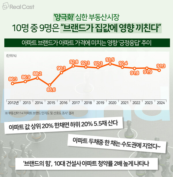 부동산R114가 매년 실시하는 ‘아파트 브랜드 인지도 및 선호도 조사’에 따르면 브랜드(건설사)가 아파트 가격에 영향을 미친다고 생각하는 이들이 2016년부터 올해까지 9년 연속, 전체 응답자의 90% 이상을 차지하고 있습니다.