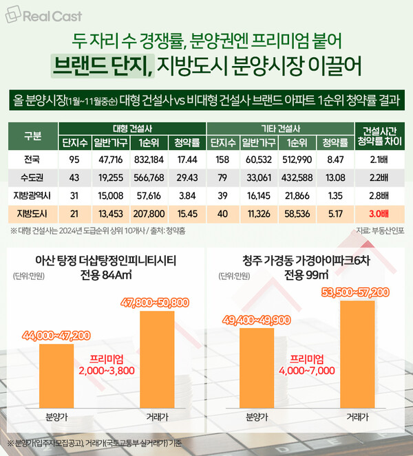 실제로 대형 건설사 브랜드 아파트와 그 외 건설사 아파트의 청약 경쟁률은 지방도시(3.0배)가 수도권(2.2배), 지방광역시(2.8배)보다 치열했습니다.