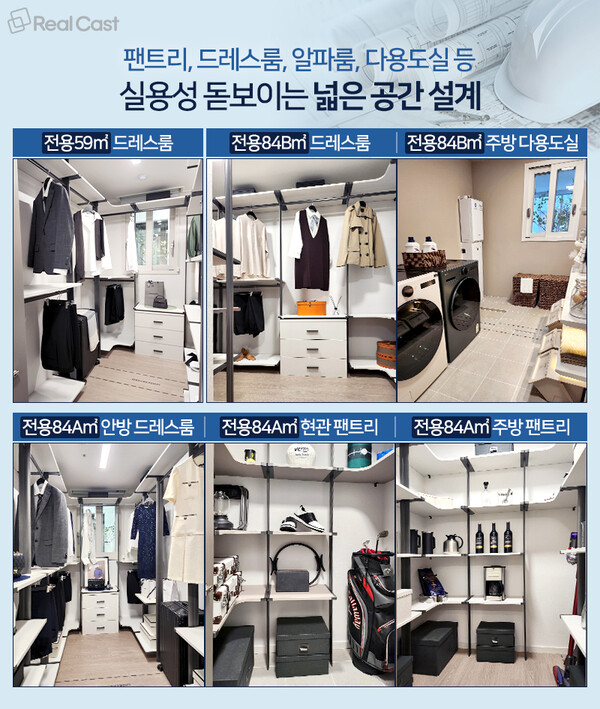 전체적으로 드레스룸, 팬트리, 알파룸 등의 공간들을 넓게 배치한 것이 눈에 띄었는데요.각각 △전용 59A㎡ 안방 드레스룸 △전용 84A㎡ 현관 팬트리, 안방 드레스룸, 주방 팬트리(알파룸 중 선택) △전용 84B㎡는 주방 뒤편 넓은 다용도실, 안방 드레스룸 등이 높은 공간 활용도를 자랑했습니다. 각 드레스룸에는 환기하기 좋은 넓은 창이 달려 있으며 각 팬트리에는 4단 높이의 시스템 선반이 설치 돼 다양한 물품을 편리하게 수납할 수 있도록 했습니다.