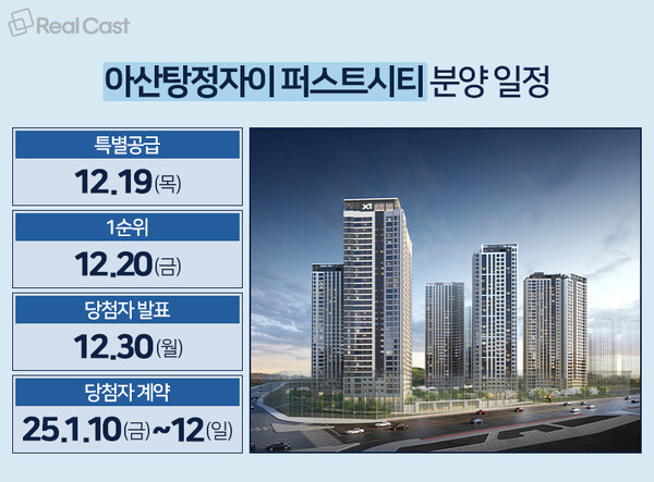 아산탕정자이 퍼스트시티는 분양일정은 12월 13일 견본주택 오픈을 시작으로 한국부동산원 청약홈에서 12월 19일 특별공급을 시작으로 20일 1순위 청약을 받을 예정입니다. 청약 당첨자는 12월 30일 발표하며, 당첨자 계약은 25년 1월 10~12일 진행 예정입니다.