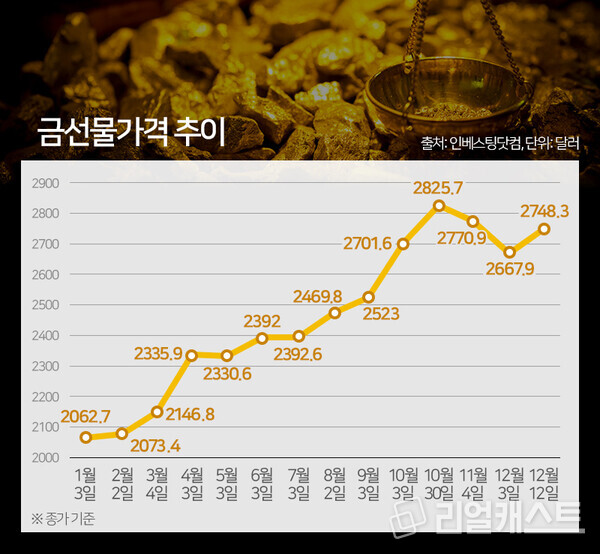 12일 뉴욕상업거래소에서 거래된 2월물 금 선물 가격은 전 거래일 대비 0.3% 하락한 트로이온스(약 31.1g, 이하 온스) 당 2748.3달러에 거래를 마쳤습니다. 이전 4거래일간 상승하다 하락했지만 종가기준 사상 최고치인 2825.7달러(10월 30일)와는 2.73%밖에 차이가 나지 않는 만큼 다시 사상 최고치를 경신할 수 있다는 이야기도 흘러나오고 있는 상황입니다.