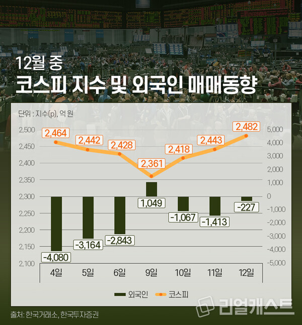 정치권의 혼란이 다소 진정된 국면에도 셀코리아는 이어지고 있습니다. 9일에 1,049억 원어치를 샀던 외국인들은 이내 10일부터 12일까지 3일 연속 팔자로 돌아섰고, 그 사이 2,707억 원어치를 더 내다 팔았습니다.