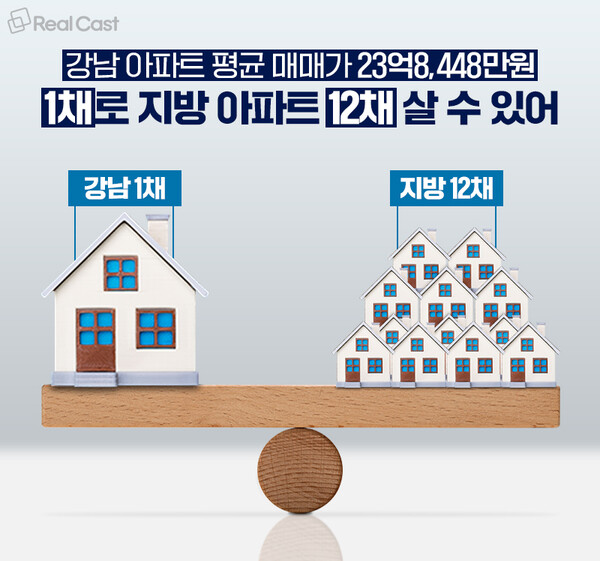 한국부동산원 월별 아파트 평균매매가격 자료에 따르면, 올 10월 기준 서울 강남구 아파트 평균 매매가는 23억8,448만원으로 전국에서 가장 높습니다. 8개도, 즉 지방 아파트 평균가격은 1억9,350만원입니다. 이렇게 되면 강남 아파트 한 채로 지방 아파트 12.3채를 살 수 있다는 얘기가 됩니다.