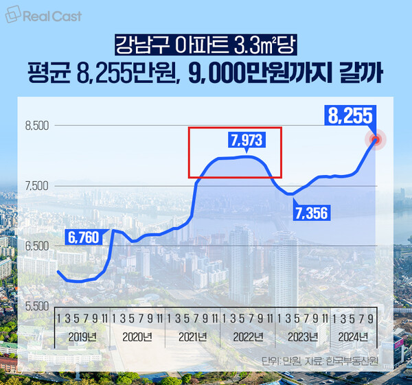 10월 기준 서울 강남구 아파트 3.3㎡당 평균 매매가는 8,255만원입니다. 이는 지난 부동산 시장 활황기였던 2022년 6월 당시 7,973만원보다도 높은 가격입니다. 이미 지난 8월부터 8,039만원으로 활황기 가격을 넘어선 상황입니다.