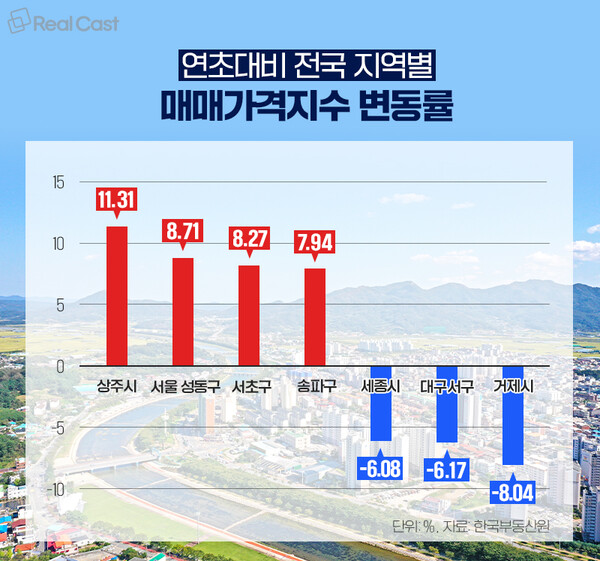 지방은 인구가 지속적으로 줄면서 주택 수요가 감소하고 있다는 것도 부동산 가격 하락의 원인으로 지적되고 있는데요. 올 한 해 경북 상주시가 11%나 상승한 것이 눈길을 끕니다. 상주시는 지역 내 공급이 없어 준신축 아파트에 수요 쏠림 현상이 나타났고, 2차전지 클러스터 산업단지 조성 계획, 공간혁신구역 선도사업 후보지 선정 등 상주시가 인구 유출을 막기 위한 노력을 지속적으로 진행해 주택 수요가 늘어난 것으로 보입니다.