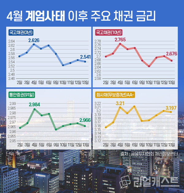 금융투자협회 채권정보센터 자료에 따르면 3년 만기 국고채 금리는 지난 13일 기준 2.541%를 기록했습니다. 계엄 해제 직후 2.626%까지 올랐던 금리가 8영업일 만에 85bp 내려온 겁니다. 외려 계엄 사태 직전 금리(2.585%)보다 낮습니다.